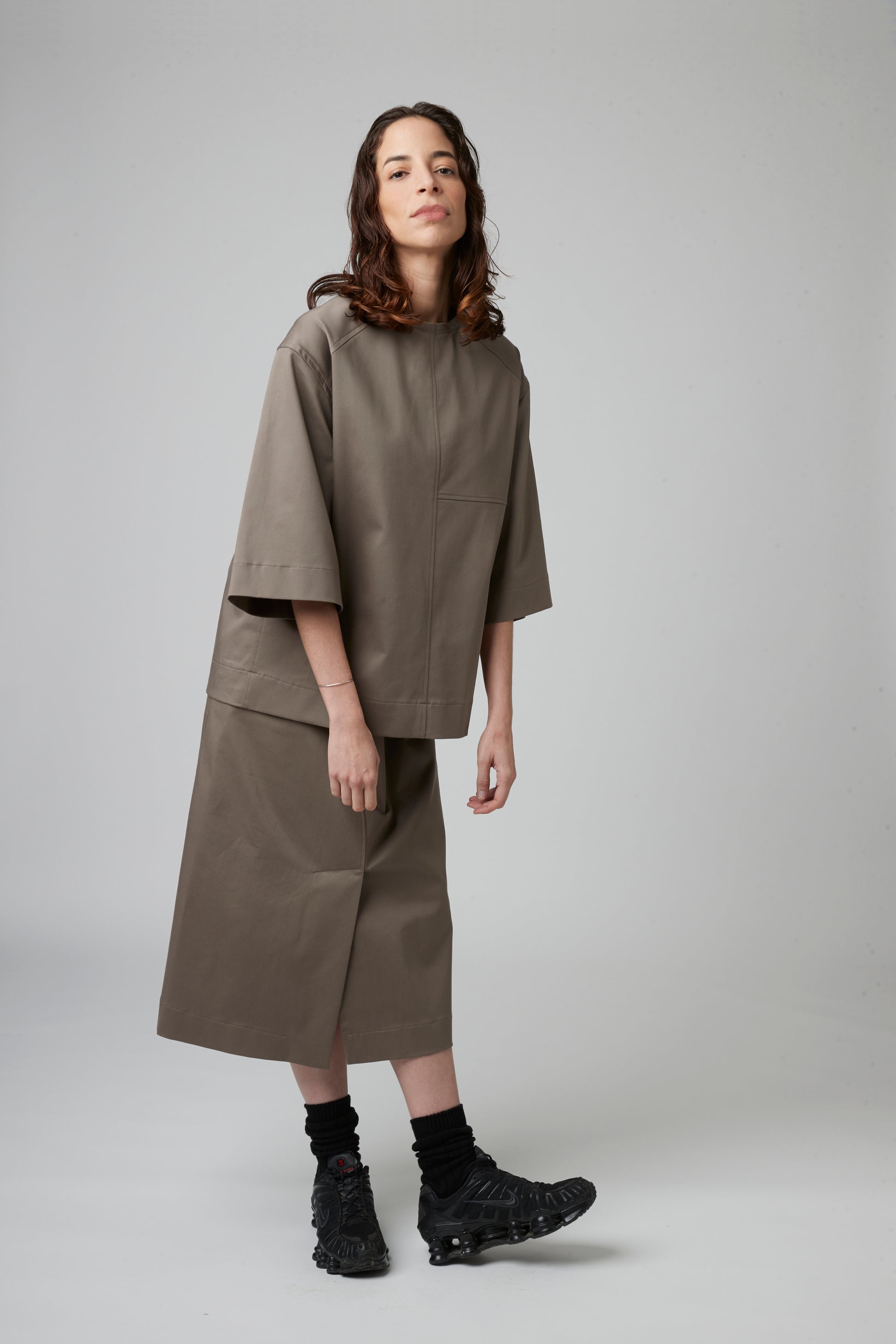 • A line skirt, below knee length with front split, an elastic waistband and two Pockets in the side seams