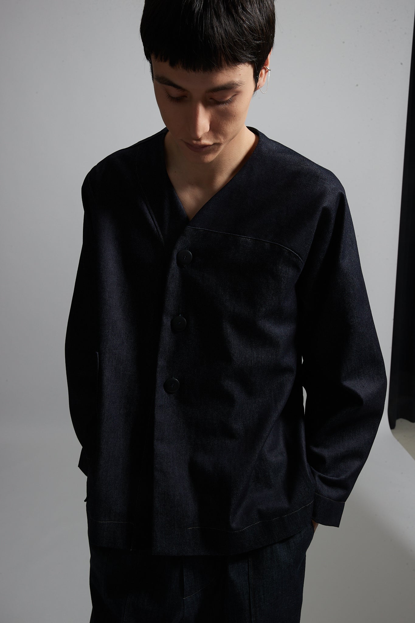 • Relaxed cardigan made of blue denim, featuring long sleeves, a patch pocket and a front button closure. Asymmetric armholes: one dropped sleeve and one hammer-shoulder sleeve.