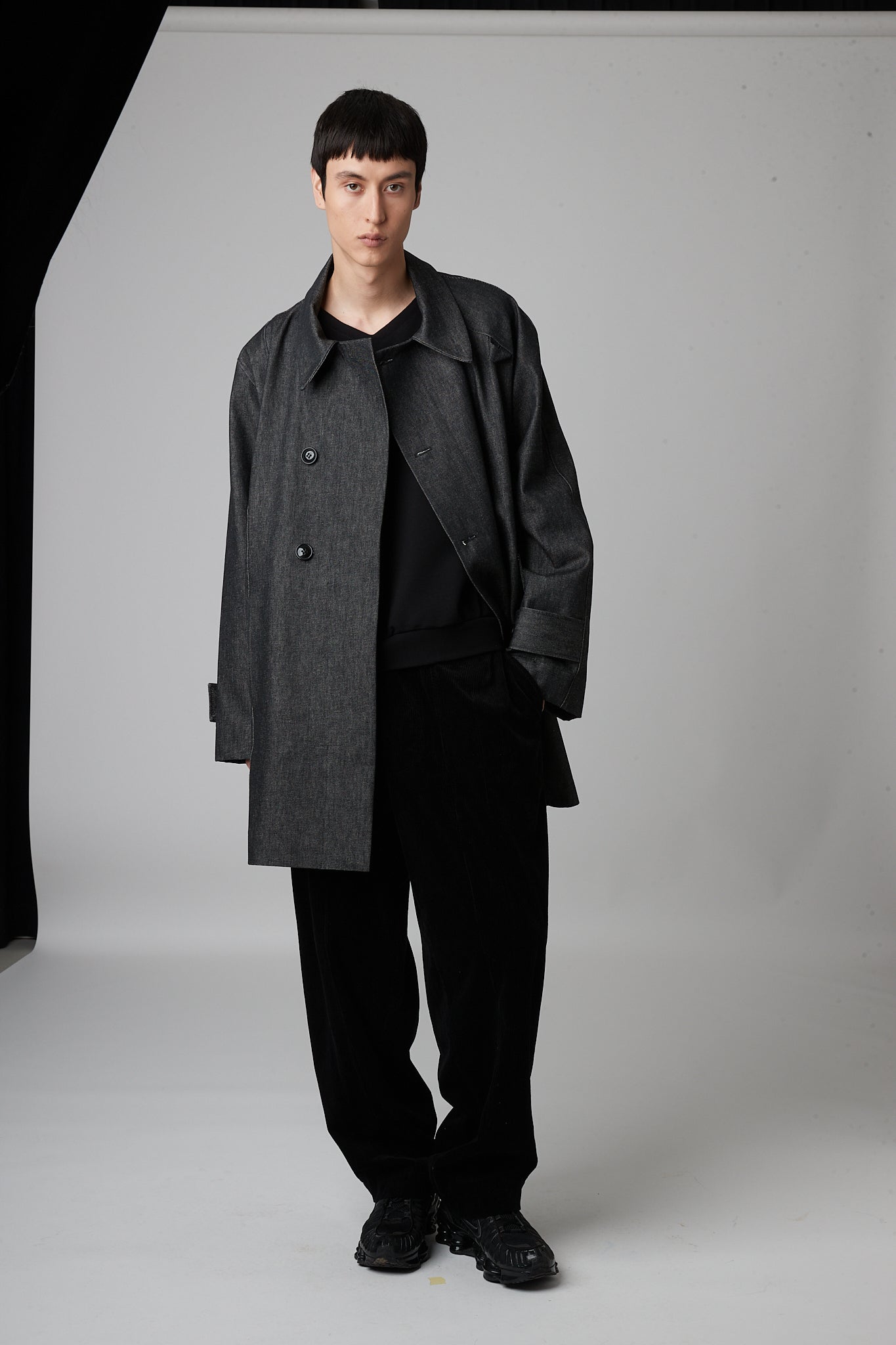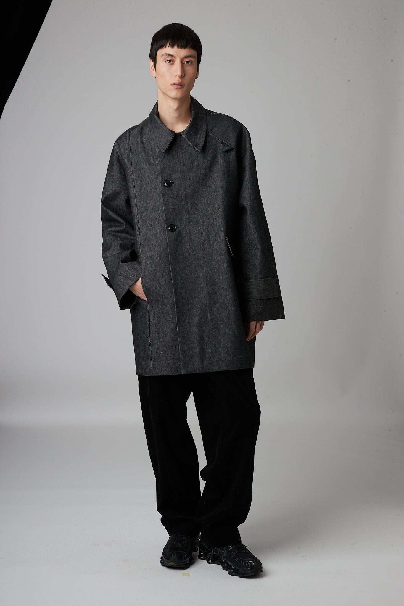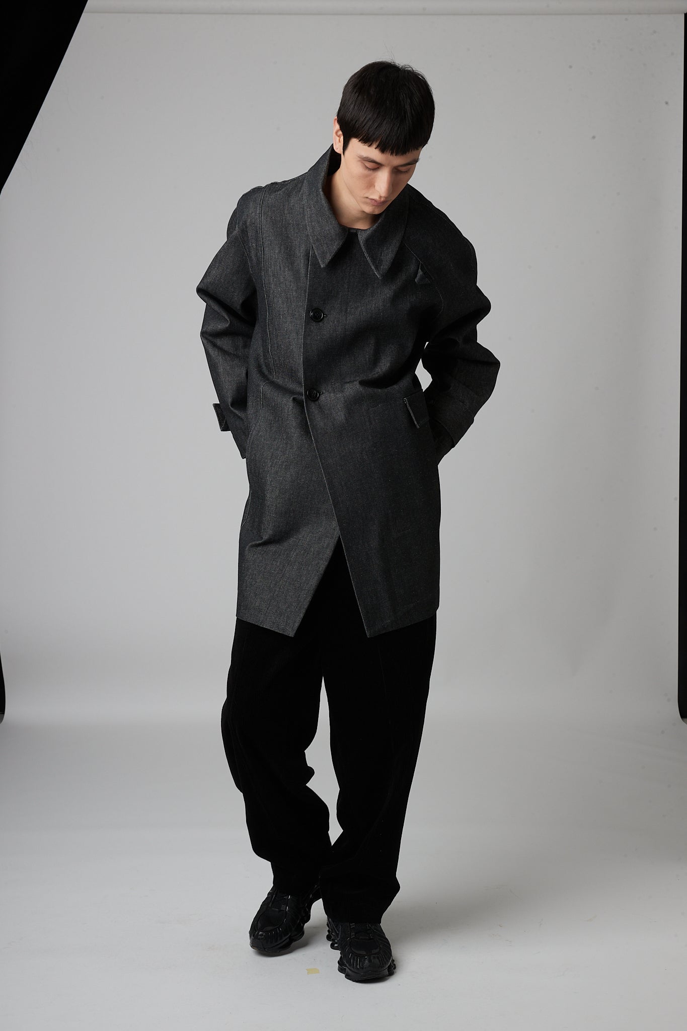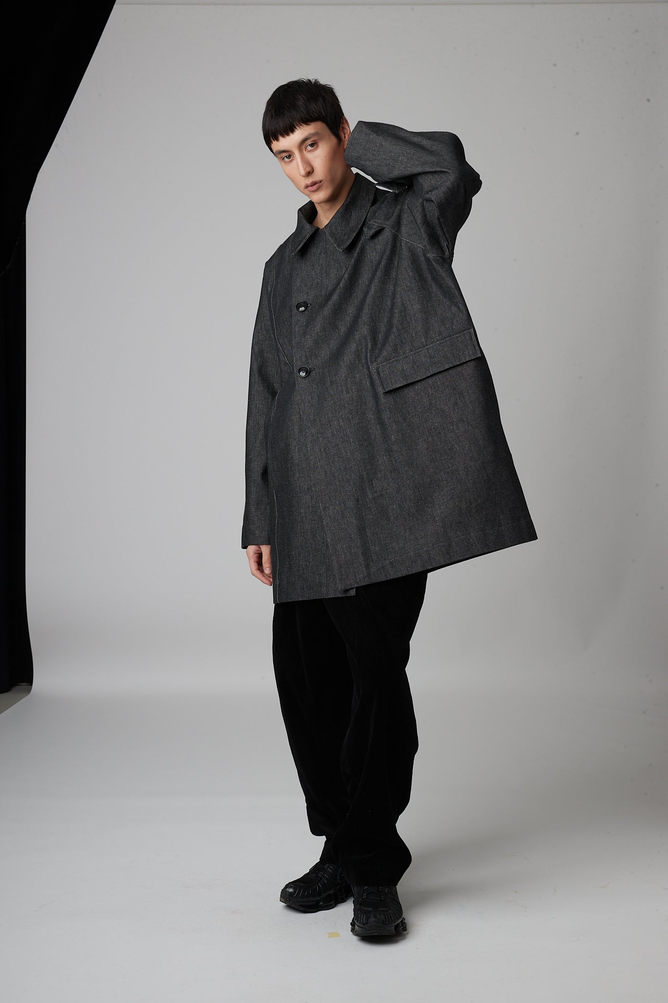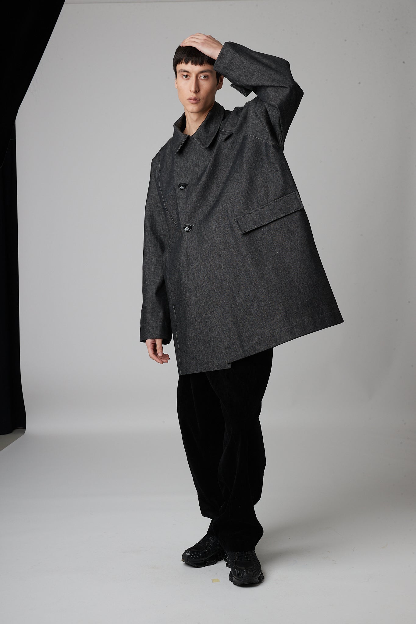 • Double-breasted pea coat with button closure, two pockets and asymmetric armholes. one dropped sleeve and one raglan sleeve.