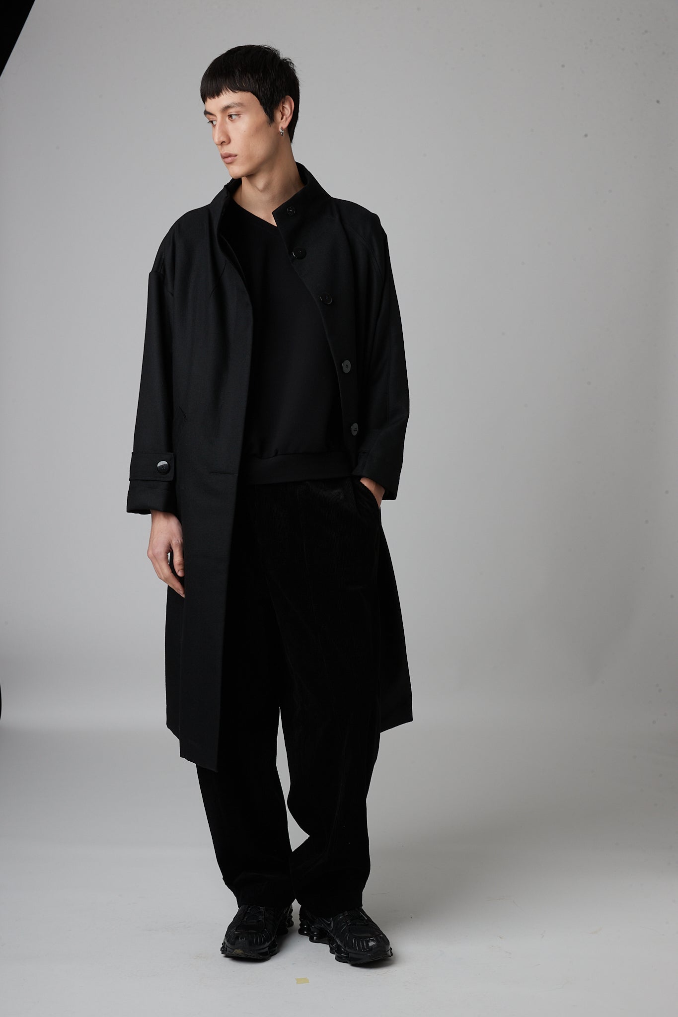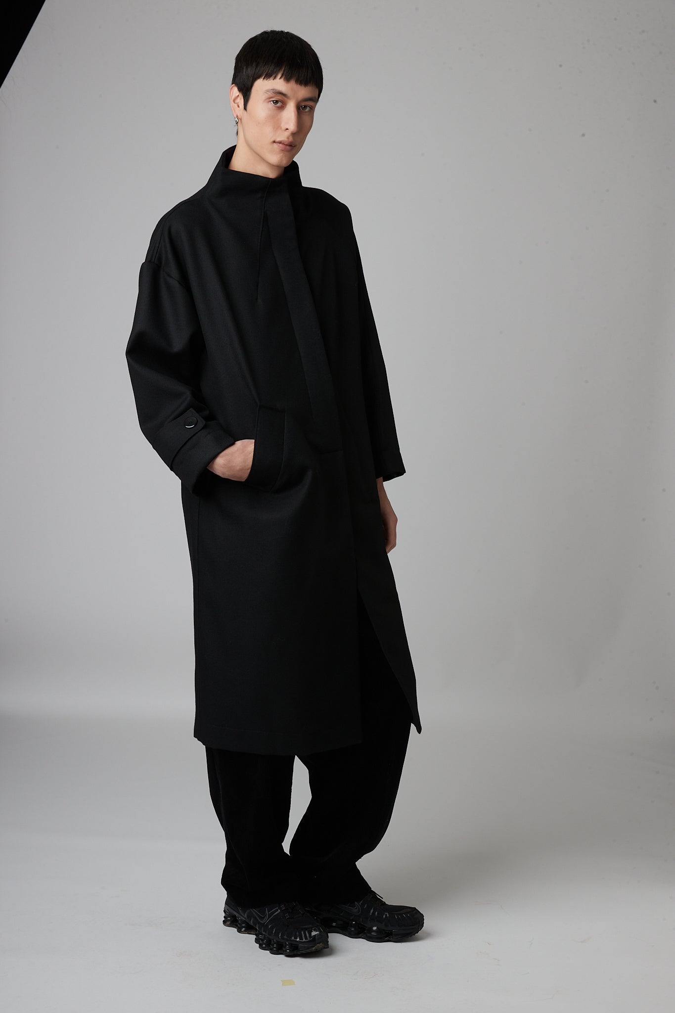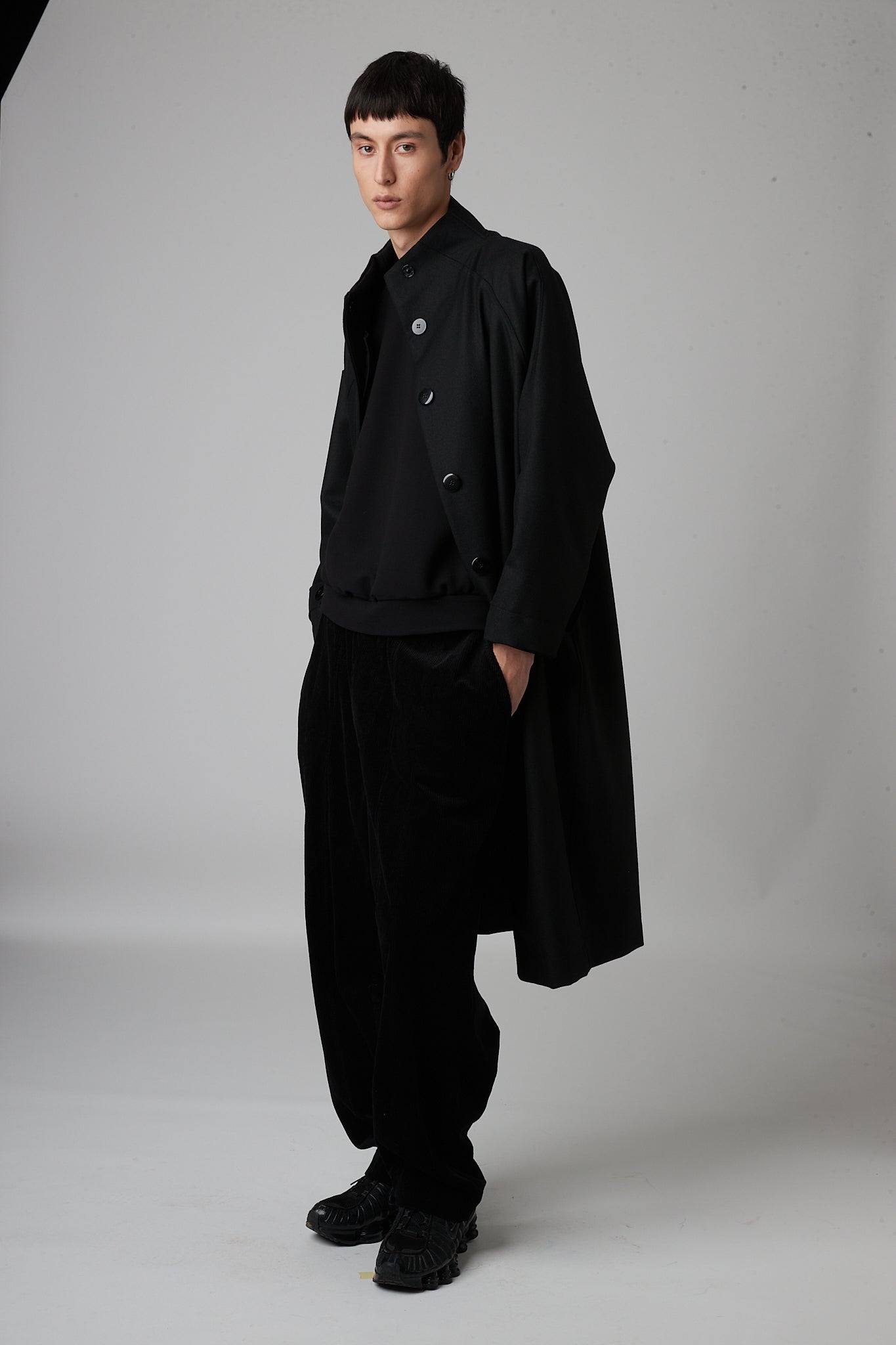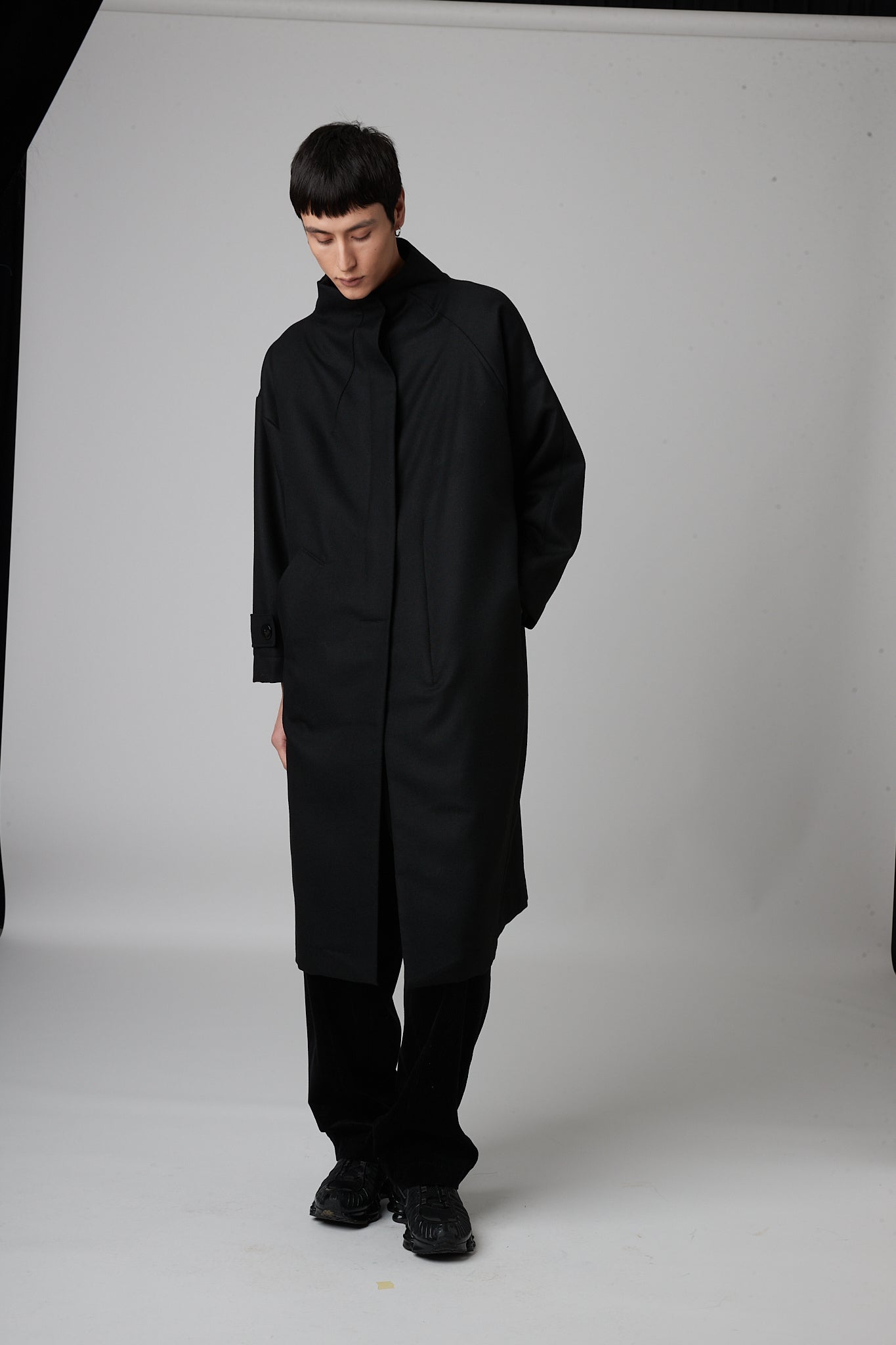 • Double-breasted pea coat with button closure, two pockets and asymmetric armholes. one dropped sleeve and one raglan sleeve.